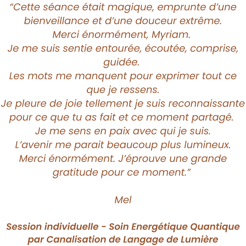 Les termes « thérapie », « guérison », « soin » et autres dérivés sont utilisés dans une démarche holistique et non médicale. Les séances/conseils ne remplacent pas un traitement médical ni une consultation avec un professionnel de santé. Un système de sessions énergétiques ne peut se substituer à un avis ou à un traitement médical (et ce en aucune façon).